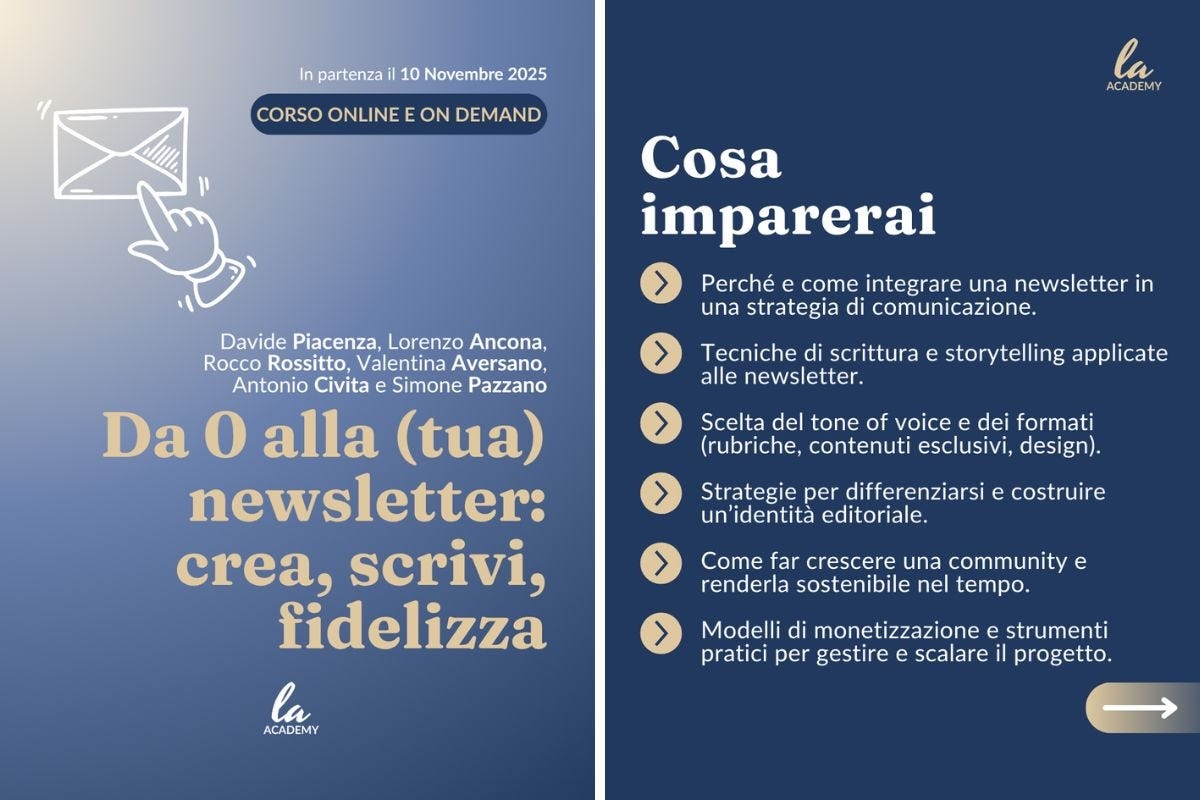 Ti ricordo che sono tra i docenti di “Da 0 alla (tua) newsletter”, corso de La Content, in cui spiegherò come scrivere una newsletter efficace: ideazione, ricerca e tecniche di storytelling. Oltre a me ci sono altri 5 docenti bravissimi e super preparati!